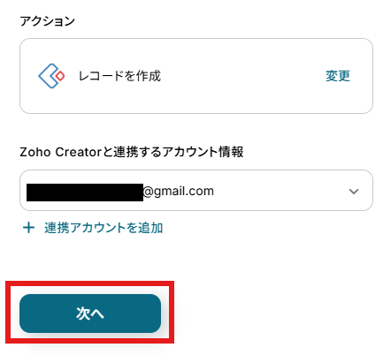 アクションはデフォルト設定のまま、アカウント情報は、連携したいアカウントが選択されているか確認してください。確認出来たら「次へ」をクリックしましょう。