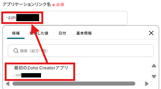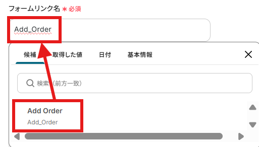 アプリケーションリンク名、フォームリンク名は候補に表示されますので、そちらから選択してください。