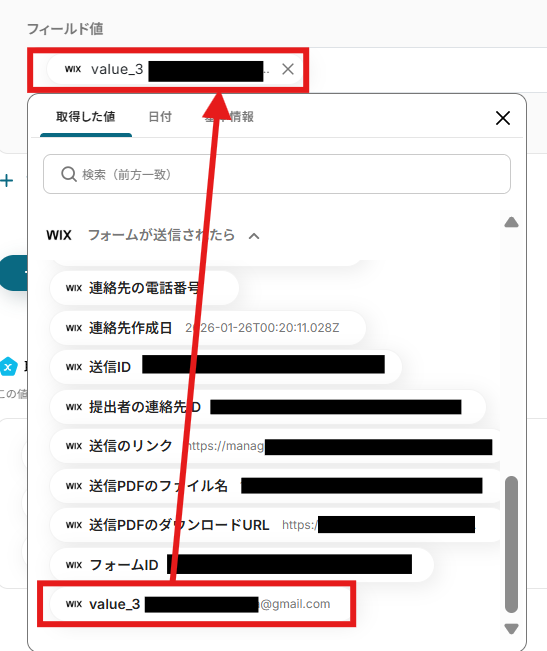 Wixで取得した値を追加する際は、JSONPathも使用できます。詳しい方法は、「『取得する値』を追加する方法」をご参照ください。