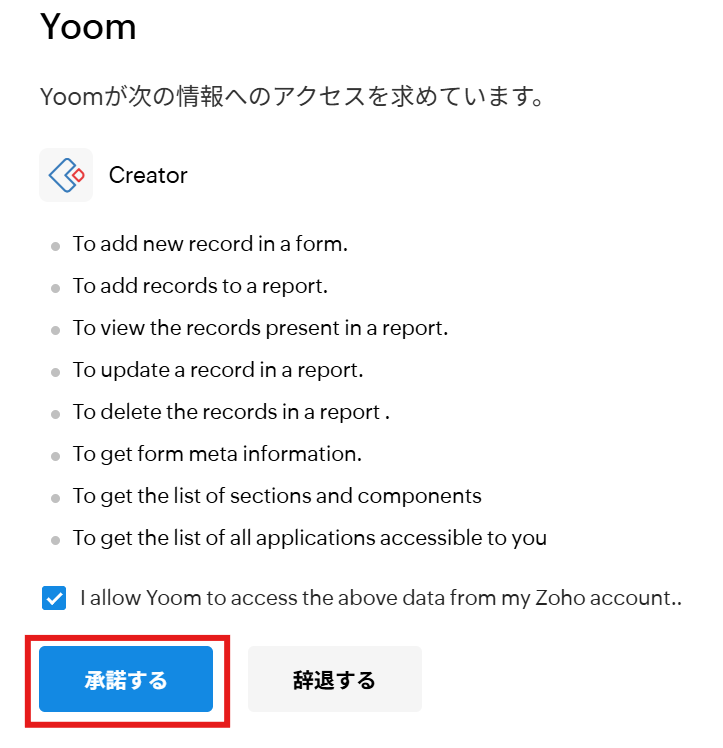 権限設定のページに遷移しますので、権限をすべて許可してください。チェックボックスにチェックを入れて、「承諾する」をクリックすればOKです。