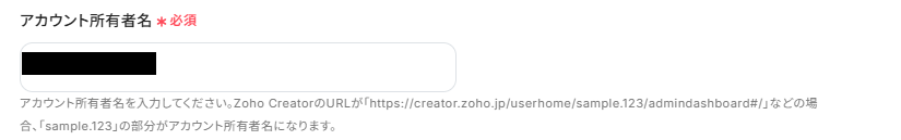- Zoho Creatorのオペレーション設定では、操作対象となる任意のアカウント所有者名、アプリケーションリンク名を設定してください。