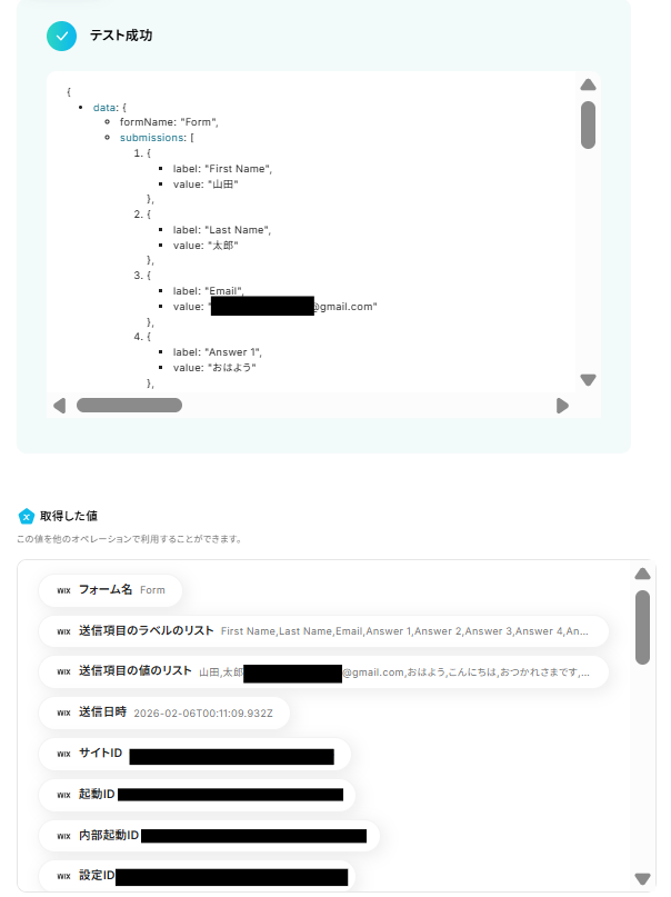 ここまで設定したら、Wixのフォームで回答を行い、テストボタンをクリックしてください。
