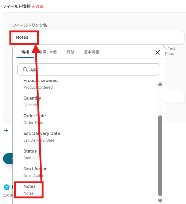 フィールド情報のフィールドリンク名も候補に表示されますので、そちらの中から選択してください。