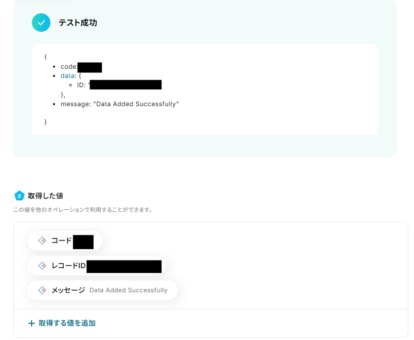 ここまで設定したらテストボタンをクリックしてください。テストが成功し取得した値が入ります。