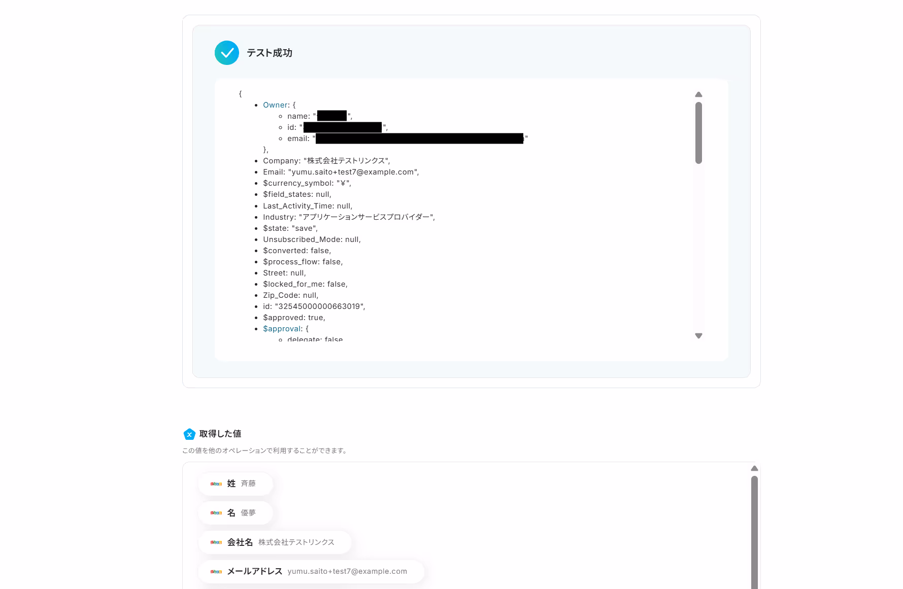 テストが成功すると、「テスト成功」という画面が表示され、Zoho CRMから取得した情報をYoomで引用できるようになります。