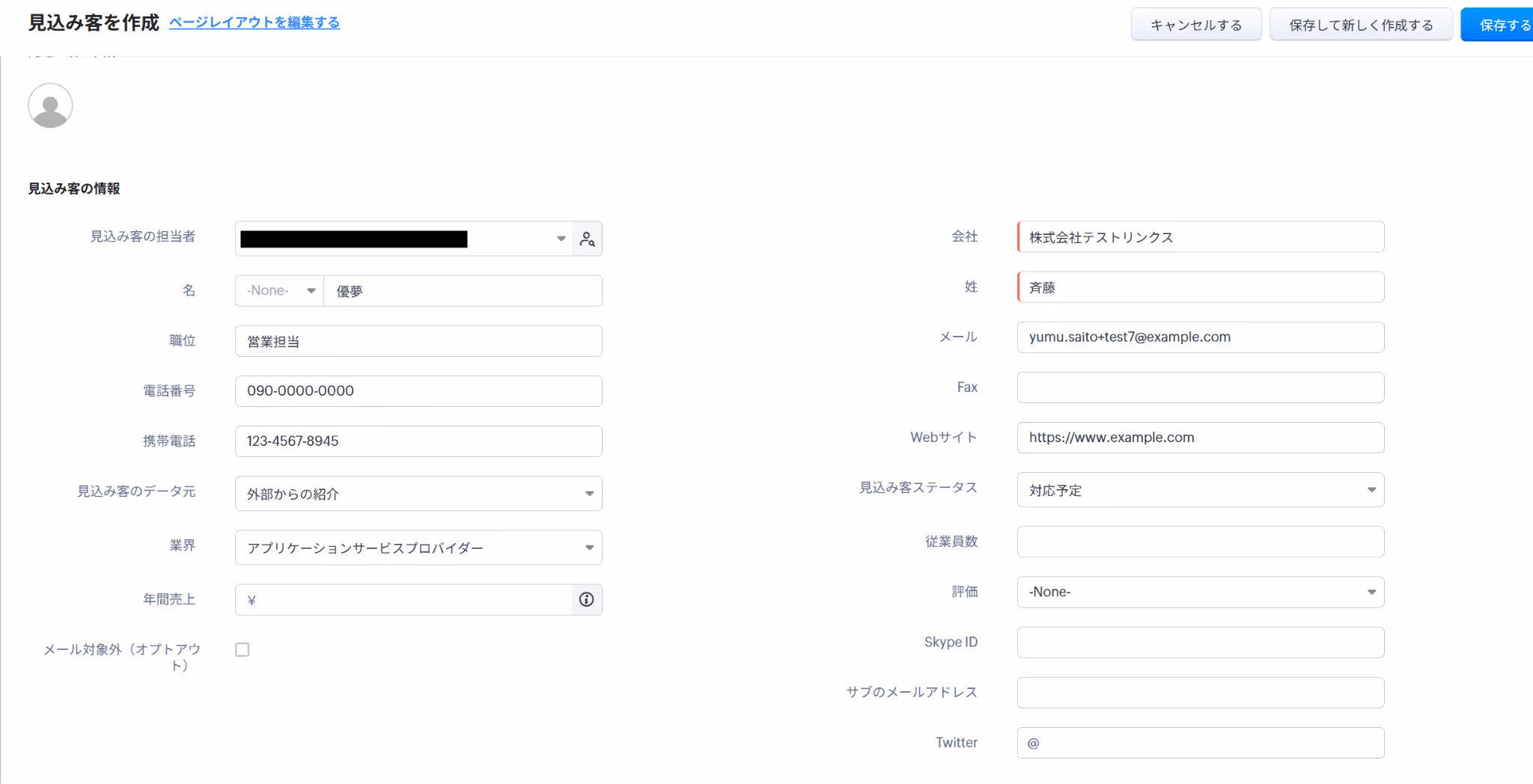 設定が終わったらZoho CRMでテストのため、見込み顧客を作成しましょう。