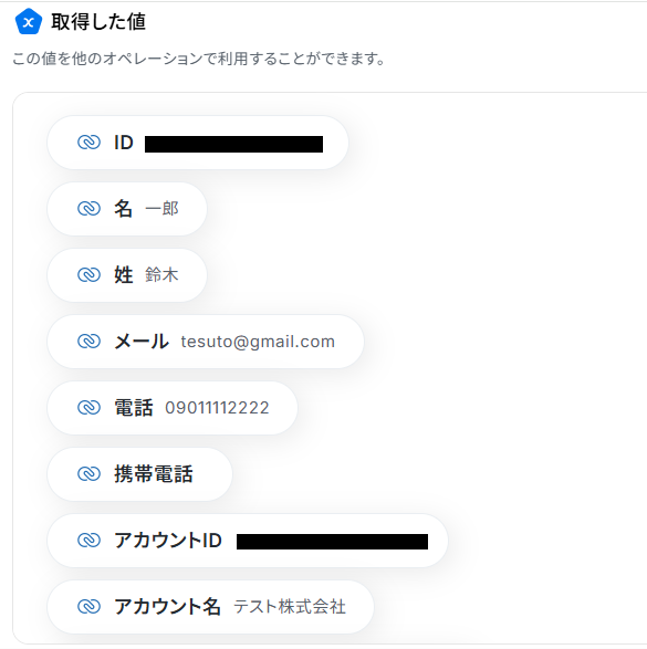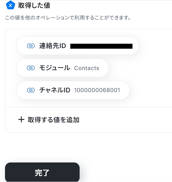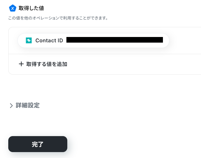 テストが成功すると、「取得した値 」 が表示されるので確認してください。 ここで取得した値は、この後設定するステップで活用することが可能です。 確認後、「完了」ボタンをクリックしましょう。 ※テストの重要性:「取得した値」のテスト値について もあわせてご確認ください。