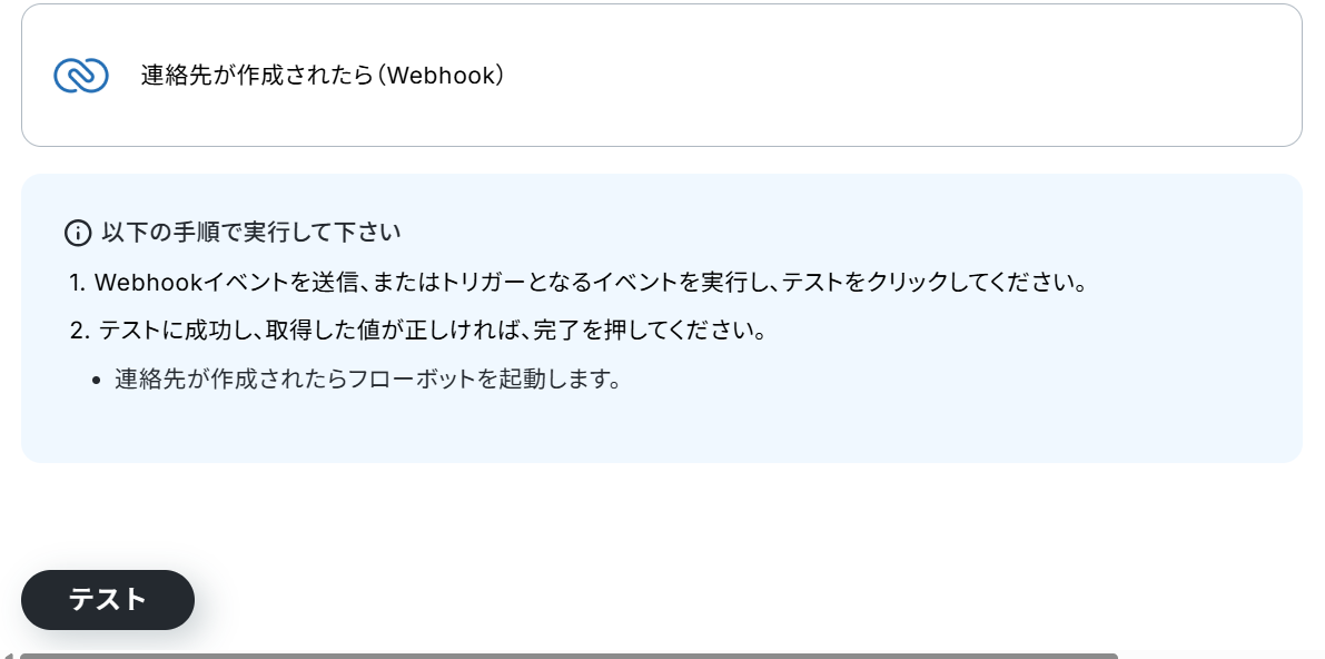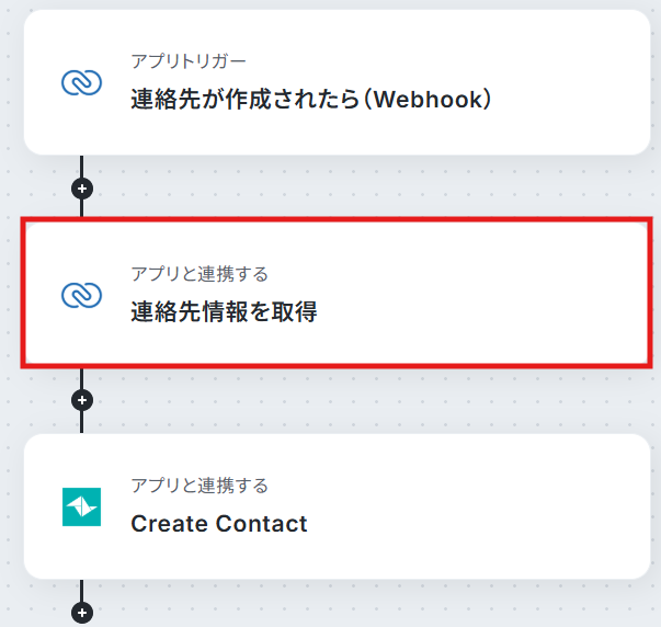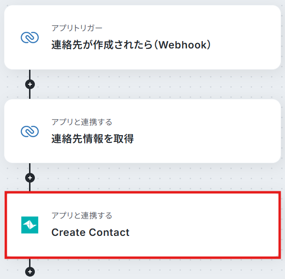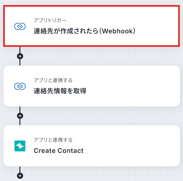 トリガー と呼びます。 まずは、「連絡先が作成されたら(Webhook)」という項目をクリックし設定しましょう。