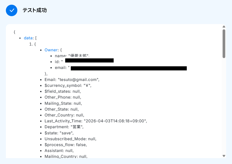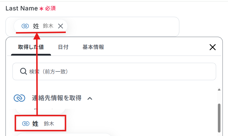 Last NameとFirst Nameは、Zoho CRMに作成された連絡先情報の「姓」「名」が自動で引用できるように設定されています。
