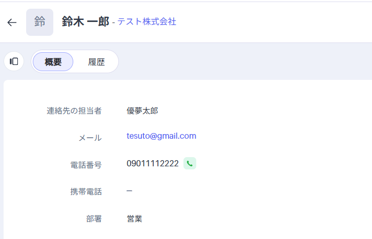 続いて、トリガーの動作テストを行います。 Zoho CRMにテスト用の連絡先を作成してください。 ※テスト用ですので、実在しない架空の情報を入力していただいて問題ありません。