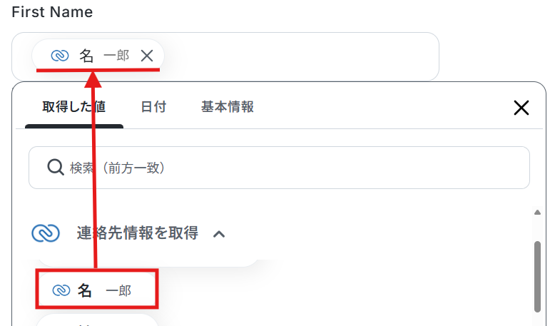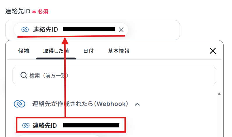 連絡先IDは、ステップ3で取得した値を使用してデフォルトで設定されているため確認しましょう。※取得した値を利用することで、トリガーが起動するたびに最新の値を自動で引用可能です。