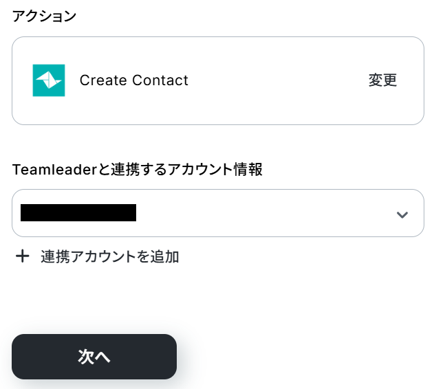 ステップ5:TeamleaderにContactを作成するアクションの設定 最後に、Zoho CRMの連絡先情報を引用しTeamleaderのContactを自動で作成するための設定をおこないます。 「Create Contact」という項目をクリックしてください。