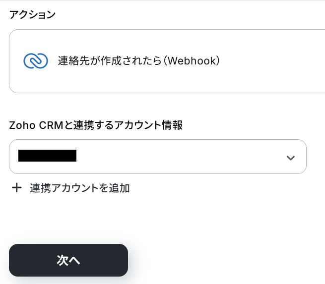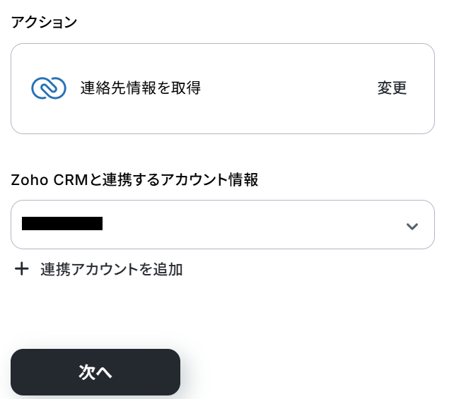 Zoho CRMと連携するアカウント情報は、ステップ1でアプリ連携したアカウントが表示されます。 プルダウンより使用したいアカウントを選択し、次のページに進んでください。