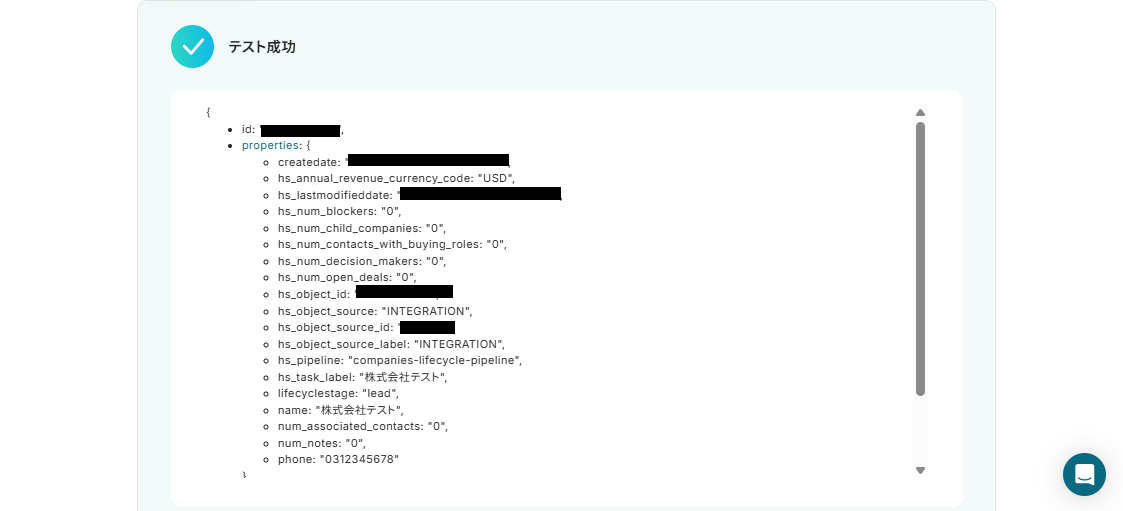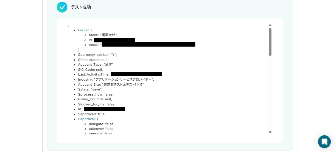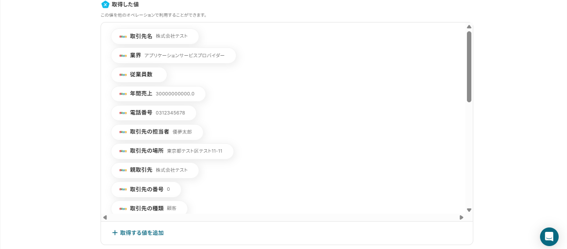 テストが成功すると、Zoho CRMに先ほど作成した取引先情報が「取得した値」に表示されます。