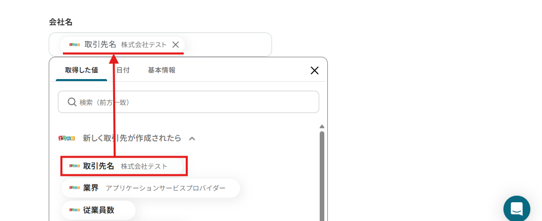 「会社名」は、先ほどトリガーの設定で取得した値を使用し設定します。