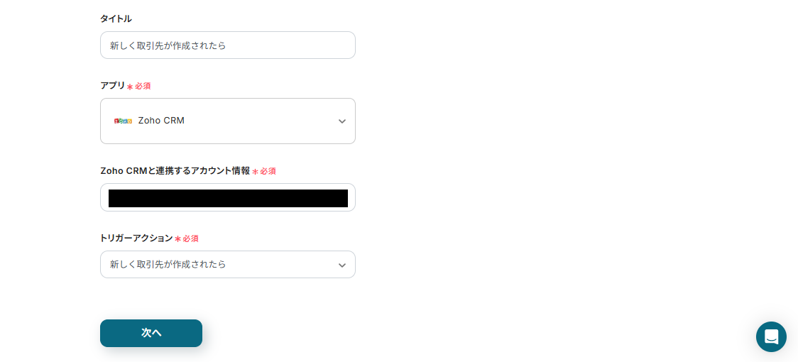 Zoho CRMの取引先が作成されたら「取引先名」を取得し、自動で反映できるように設定されているので確認してください。