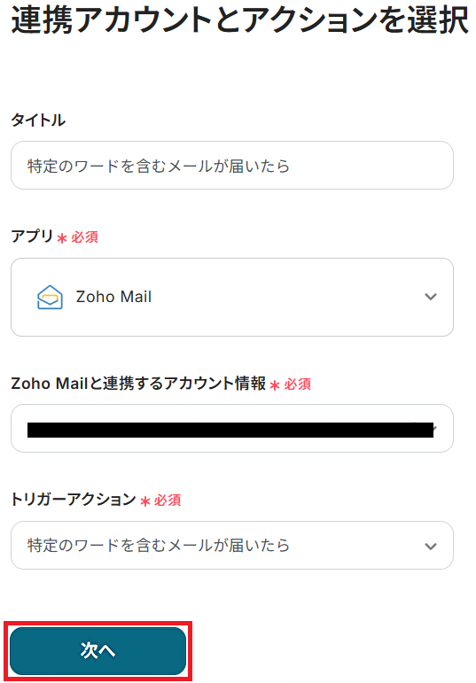 タイトルと連携するアカウント情報を任意で設定し、トリガーアクションはテンプレート通りに「特定のワードを含むメールが届いたら」のまま「次へ」をクリックします。