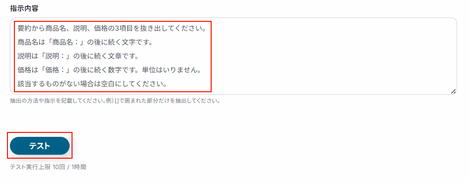 テキストの抽出はAIが行います。指示内容を記載しなくても抽出は可能ですが、より正確に抽出するためにも具体的に指示内容を記入してください。
