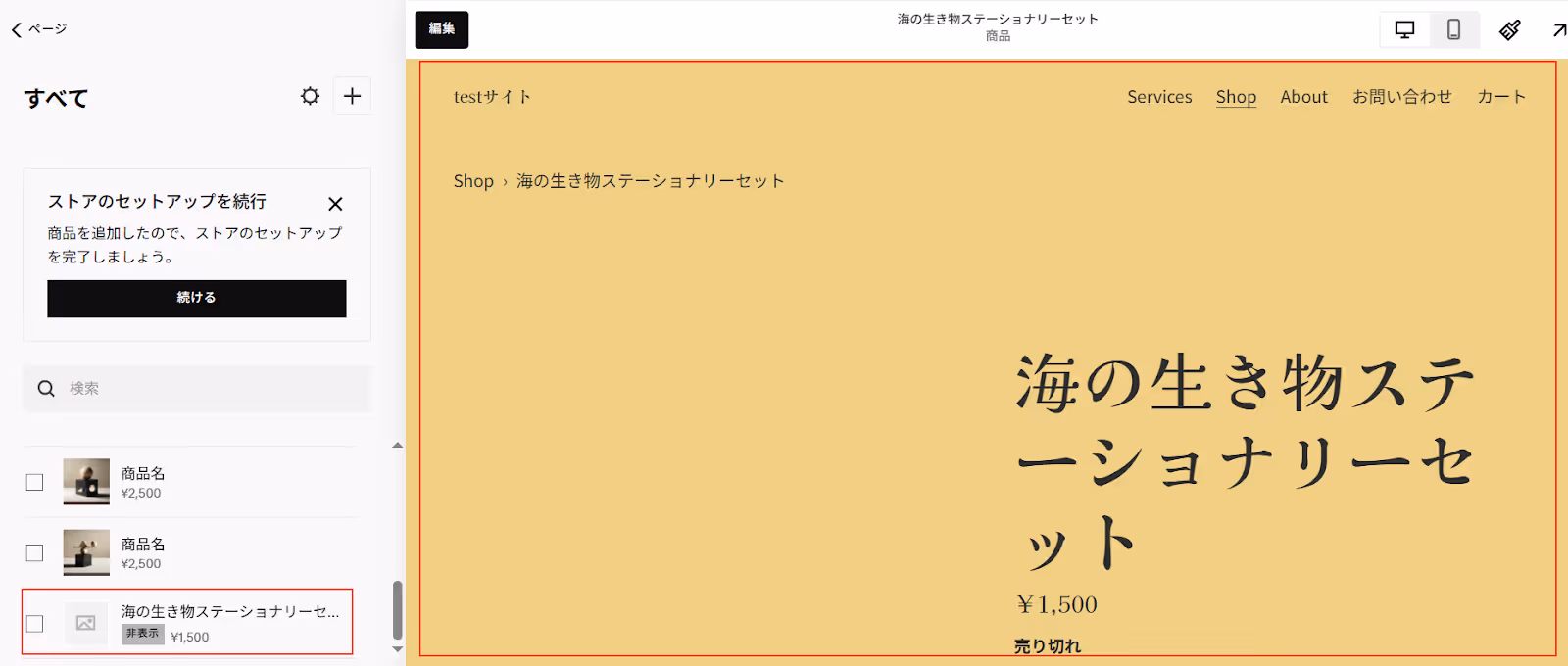 テストに成功するとテスト成功画面が表示されるので、Squarespaceに商品が作成されたことを確認しましょう。