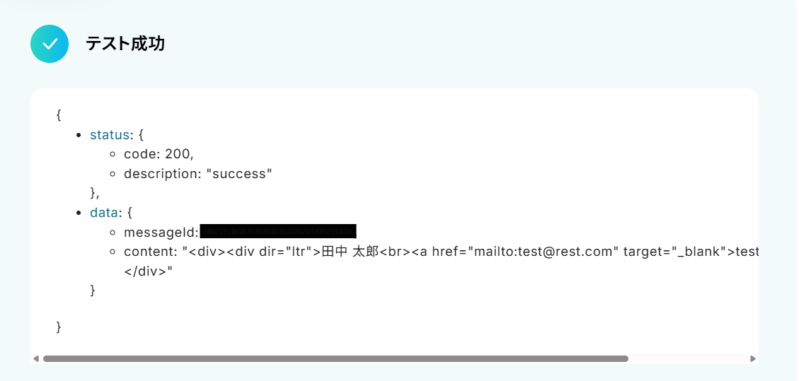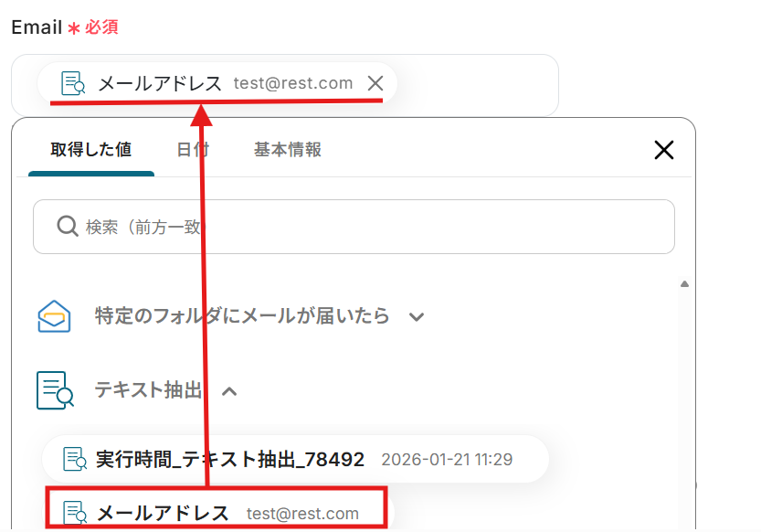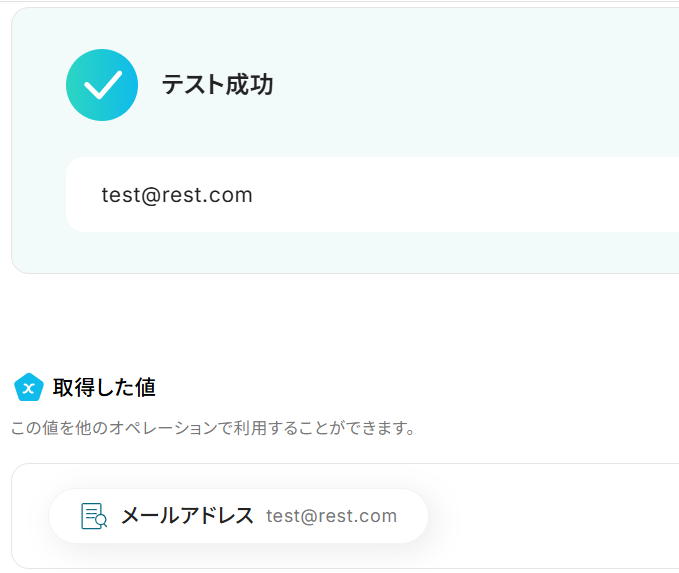 設定が完了したらテストを実行してください。 取得した値に、抽出されたメールアドレスが表示されるので確認し保存してください。