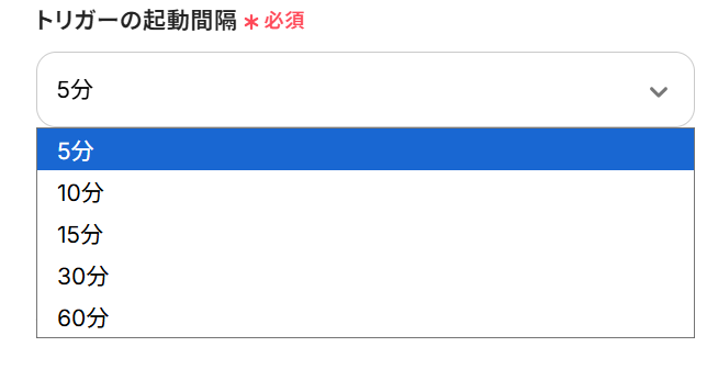 トリガーの起動タイミングは、5分、10分、15分、30分、60分のいずれかで設定できます。ご利用プラン によって、設定できるトリガーの最短間隔が違うのでご注意ください。 ※基本的にはそのプランの最短の起動間隔がおすすめです!