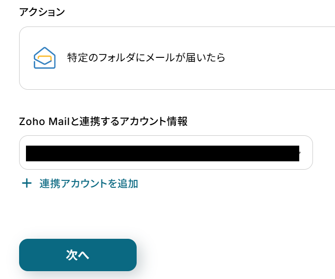 Zoho Mailと連携するアカウント情報には、先ほどマイアプリ連携をしたアカウントが表示されます。 確認できたら、「次へ」ボタンをクリックしてください。