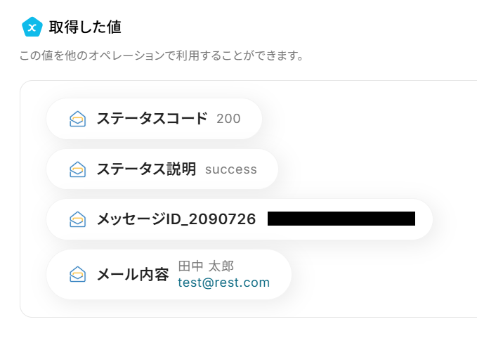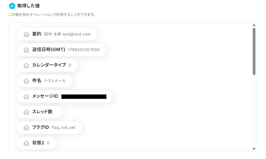 Yoomの設定画面に戻り、テストを実行します。 テストが成功すると、メールの情報が取得した値に反映されるので、確認後「完了」ボタンをクリックしてください。 ※取得した値 とは? トリガーやオペレーション設定時に、「テスト」を実行して取得した値のことを指します。 後続のオペレーション設定時の値として利用でき、フローボットを起動する度に変動した値となります。