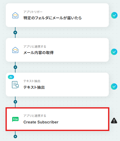 ステップ6:MailerLiteのSubscriberを作成する 最後に、Zoho Mailで受信したメールの内容から取得したメールアドレスを使用し、MailerLiteのSubscriberを作成する設定を行います。