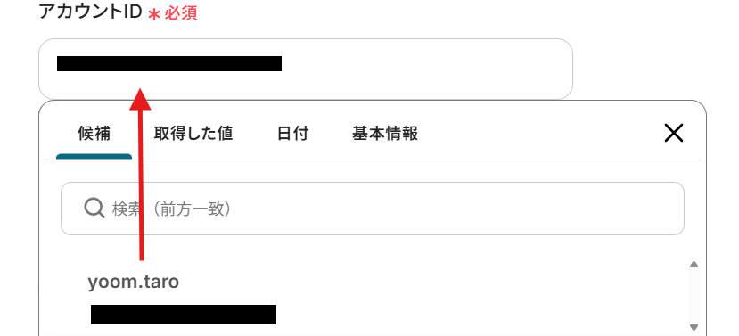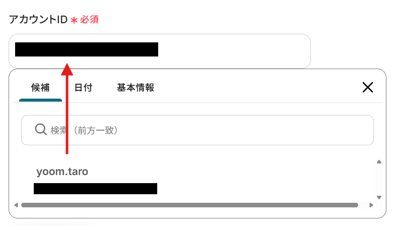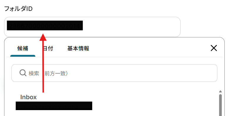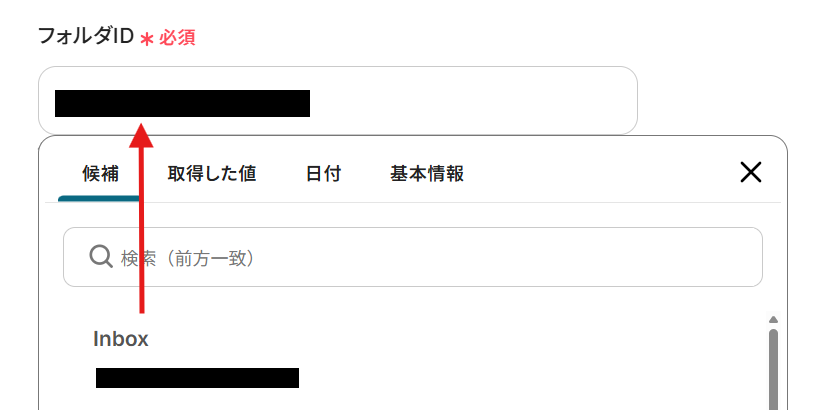 アカウントIDとフォルダIDは、枠内をクリックし表示される候補から選択してください。