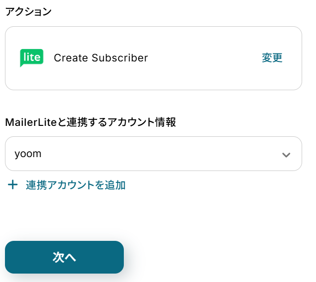MailerLiteと連携するアカウント情報に誤りがないことを確認し、「次へ」をクリックしてください。