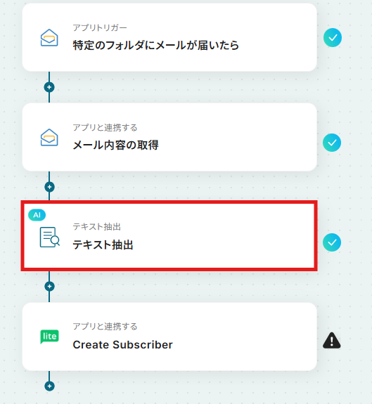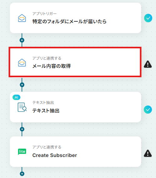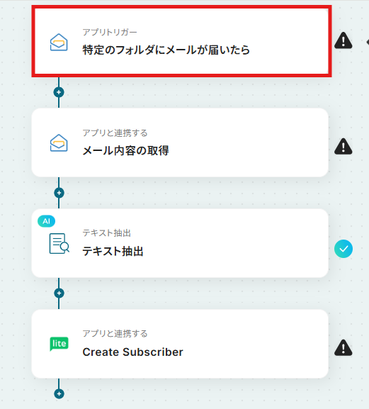 はじめに、Zoho MailとMailerLiteをYoomと連携します。 次に、トリガーでZoho Mailを選択し、「特定のフォルダにメールが届いたら」というアクションを設定します。 次に、オペレーションでZoho Mailを選択し、「メール内容の取得」というアクションを設定します。 次に、オペレーションでAI機能の「テキスト抽出」を設定し、メールから必要な情報を抽出します。 最後に、オペレーションでMailerLiteの「Create Subscriber」アクションを設定し、受信したメールから取得・抽出した情報をもとに購読者を追加します。 ※「トリガー」:フロー起動のきっかけとなるアクション、「オペレーション」:トリガー起動後、フロー内で処理を行うアクション■このワークフローのカスタムポイント