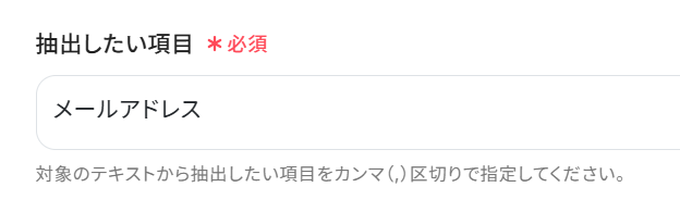 対象のテキストと抽出したい項目は、下記画像の通りデフォルトで設定されています。 抽出したい項目は自由に変更できます。 今回は例として、メールアドレスを連携できるように設定しています。 そのほかに、名前など追加したい項目があれば、あわせて設定してください。