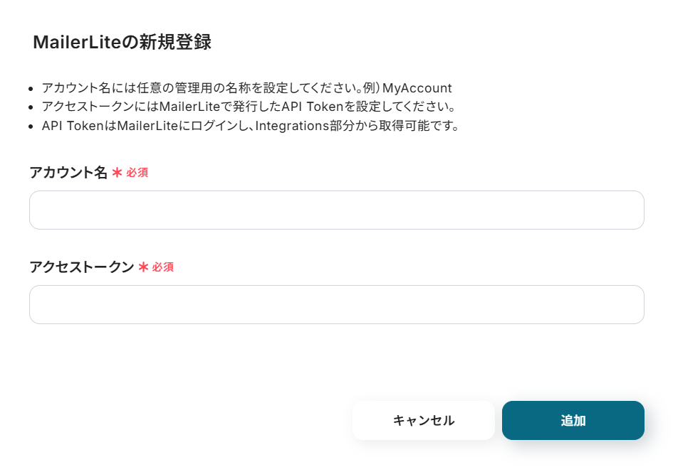 アカウント名は、メールアドレスなど任意の名前を設定できます。 アクセストークンはMailerLiteにログインしてAPI Tokenを発行してください。