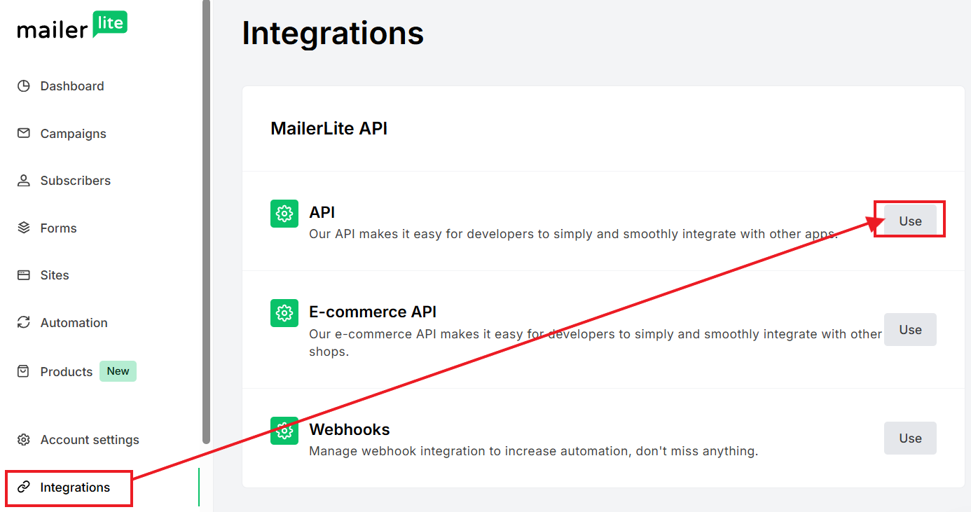 〈API Tokenの発行方法〉 MailerLiteにログインして、Integrations をクリックし、API部分のUse ボタンをクリックするとAPI Tokenを発行できます。