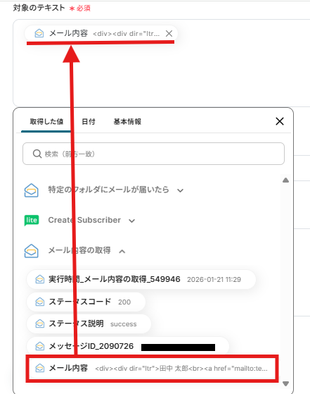 ステップ5:メールの内容からテキストを抽出する 次に、Zoho Mailで受信したメールの内容からMailerLiteのサブスクライバーに登録するメールアドレスを抽出します。