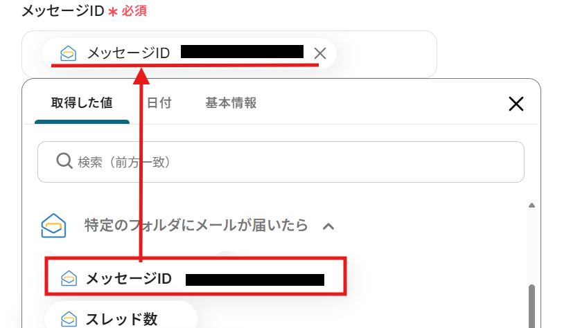 メッセージIDは、下記画像の通りステップ3で取得した「メッセージID」が反映されるようにデフォルトで設定されているので確認しましょう。※取得した値を活用することで、値を固定せずフローボット起動時に常に最新の情報を自動反映できます。
