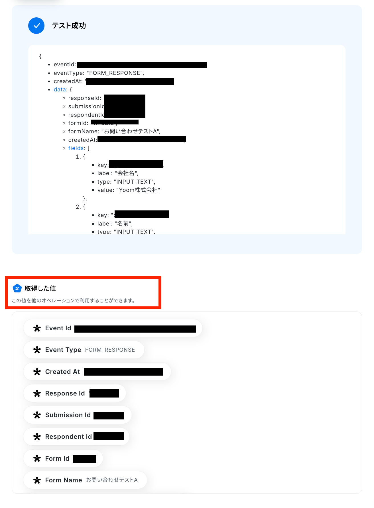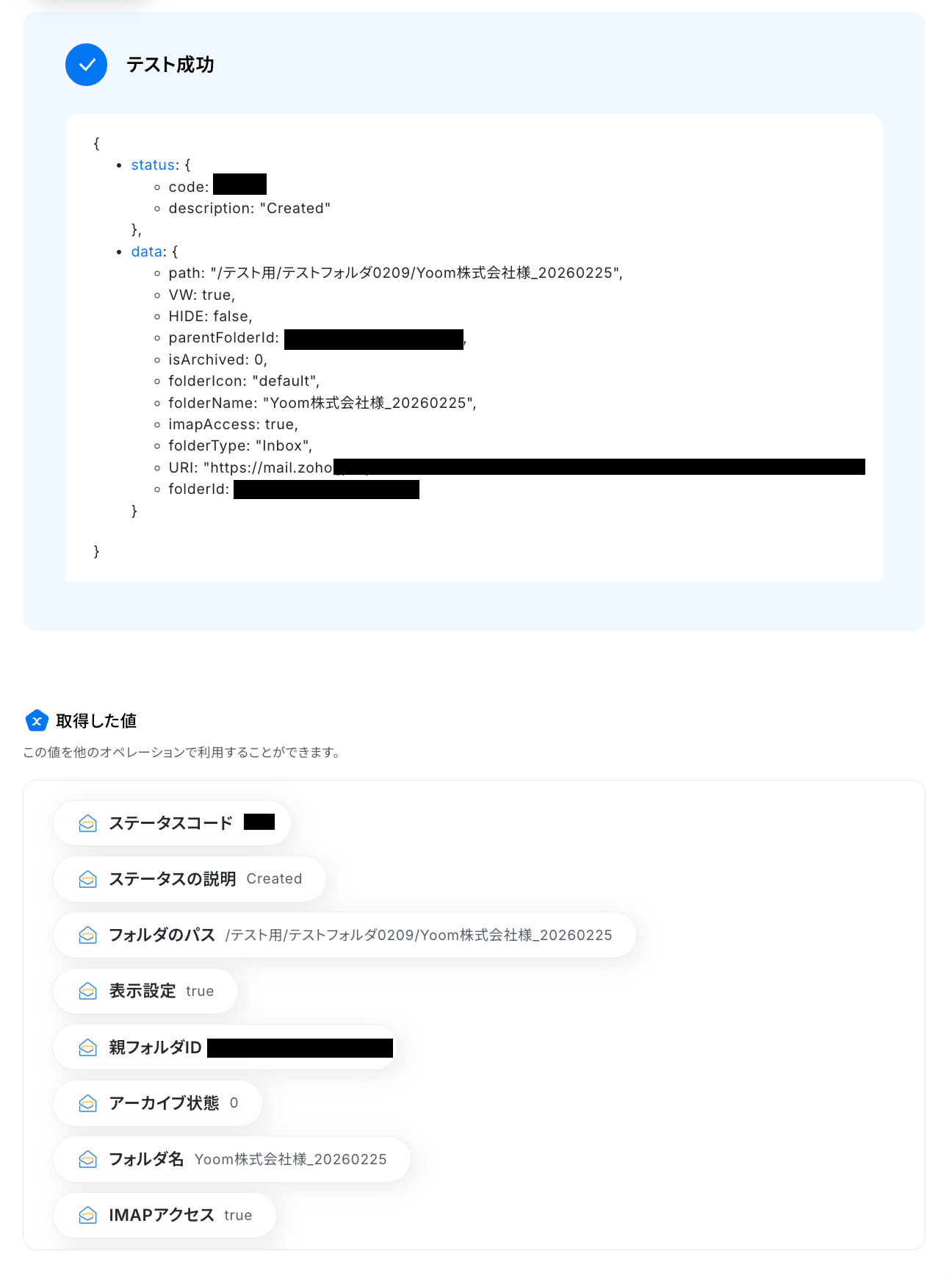 テスト成功で、取得した値 に値が反映されます。