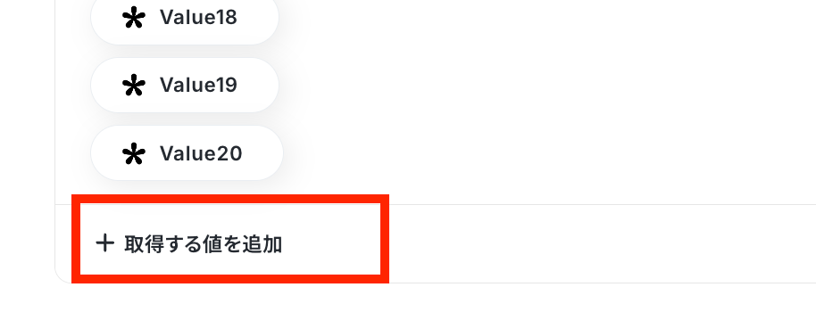 次に「取得する値を追加」をクリックします。 ※取得する値を設定する方法については「取得する値を追加する方法」 のヘルプページもご覧ください。