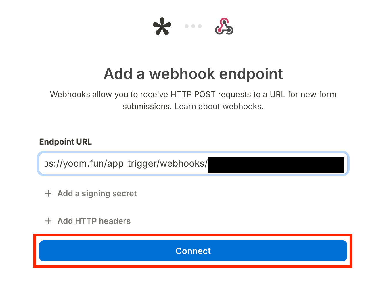 Endpoint URLの欄が表示されるので、先ほどコピーしたWebhookのURLを貼り付けて、「Connect」を押します。