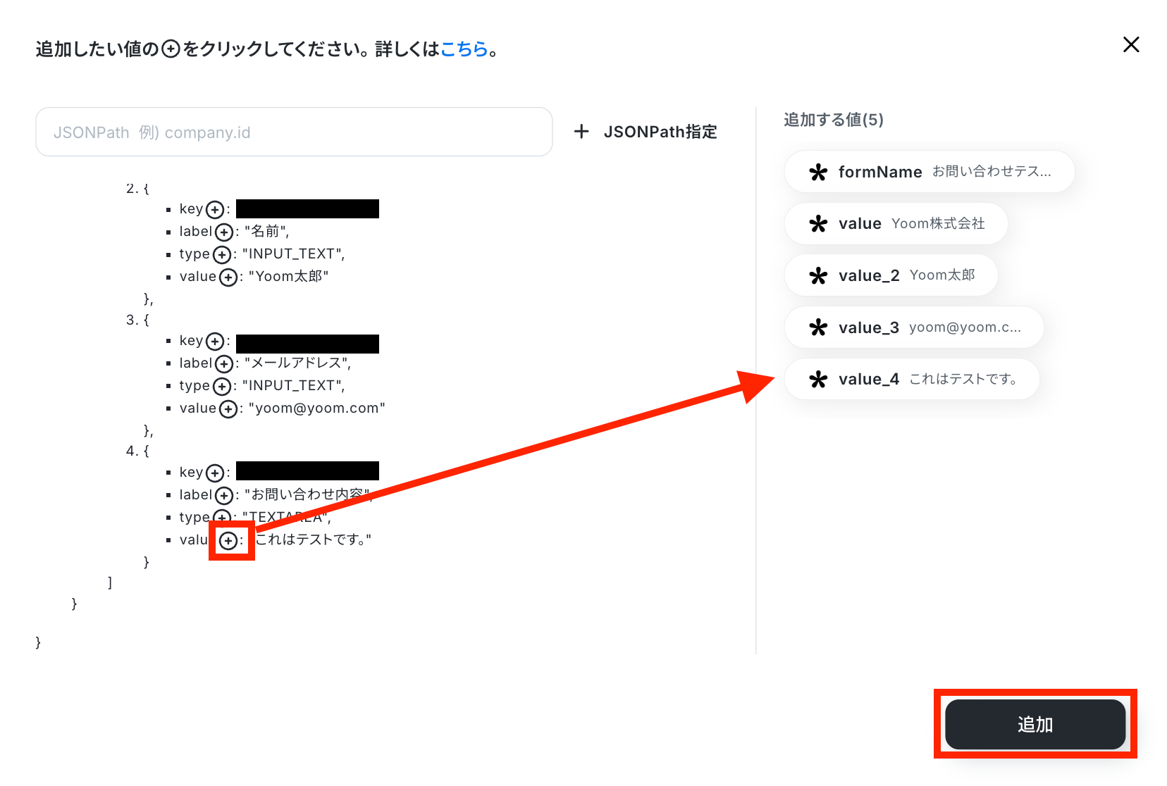 追加したい項目の右にあるプラスマークをクリックして追加する値を選択し、「追加」ボタンを押します。