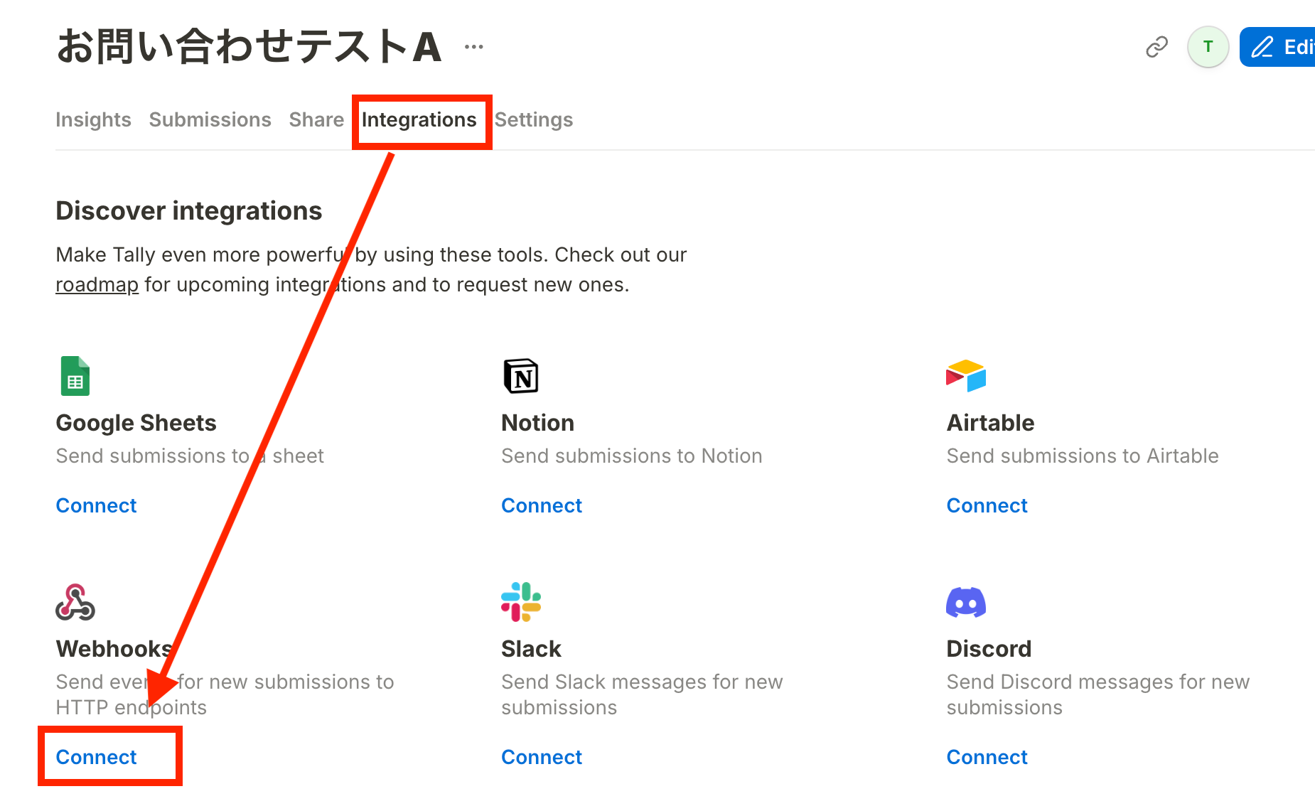 対象のフォームの「Integrations」の項目からWebhookを選択します。