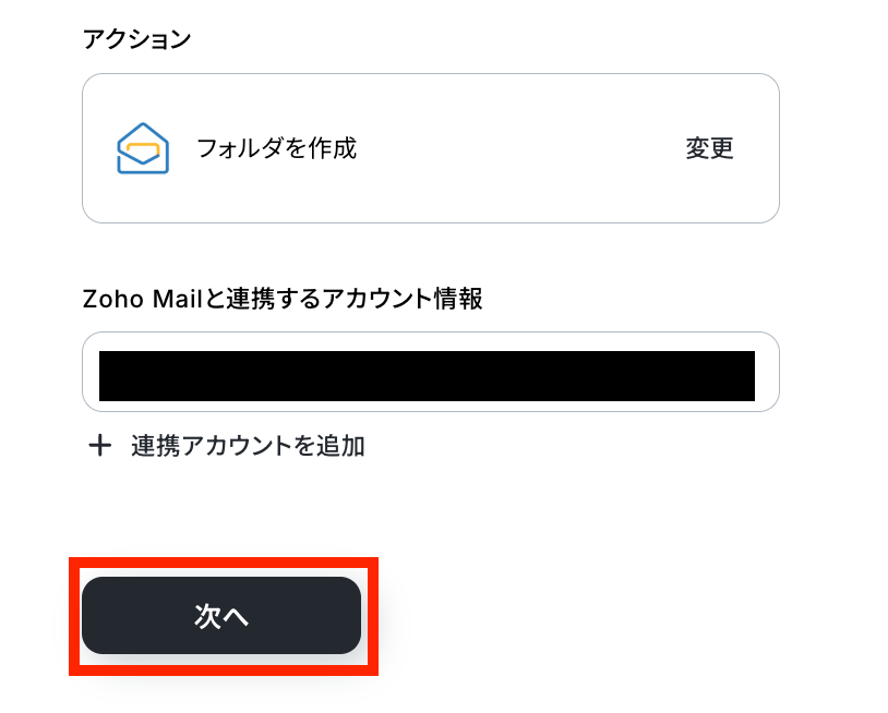 ステップ4:Zoho Mailのアクション設定 取得した値を利用してZoho Mailでフォルダを作成する設定を行います。2つ目の赤枠をクリックしましょう!