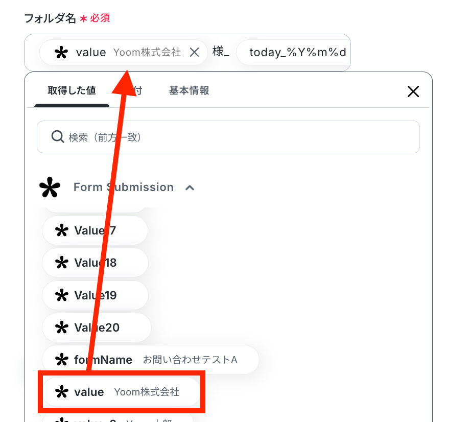 フォルダ名を取得した値を用いて設定します。