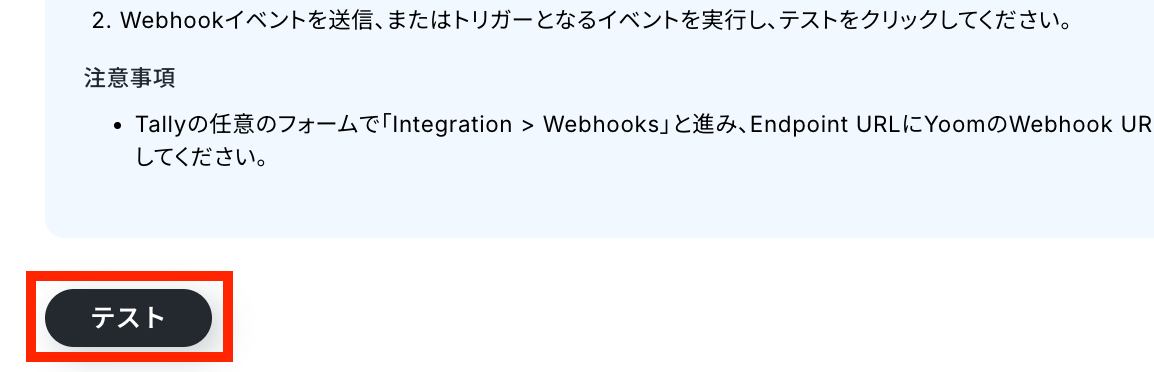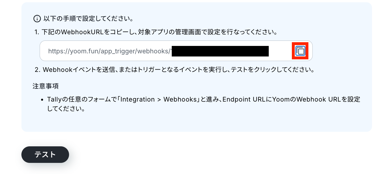 Tallyの管理画面でWebhookの設定を行います。WebhookのURLをコピーしてください。