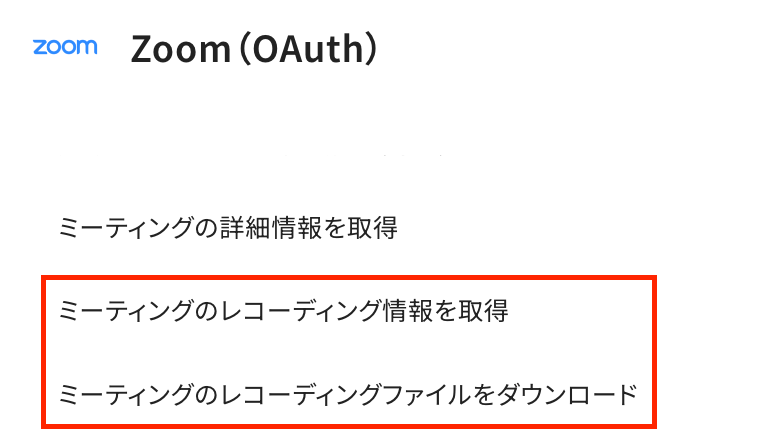 ミーティングの録画データを連携したい場合は、Zoomの「ミーティングのレコーディング情報を取得」と、「ミーティングのレコーディングファイルをダウンロード」オペレーションをご活用ください。