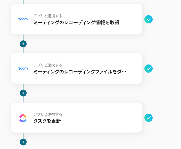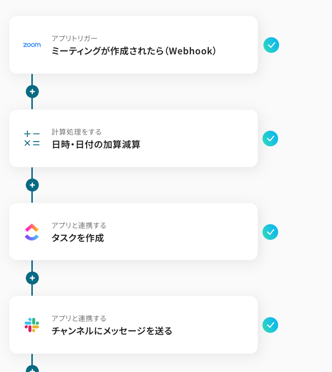このワークフローを活用すれば、Zoomで新規ミーティングが作成されると、その情報をもとにClickUpへ自動でタスクを作成できます。