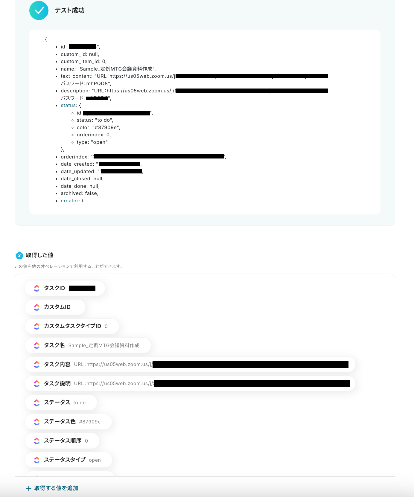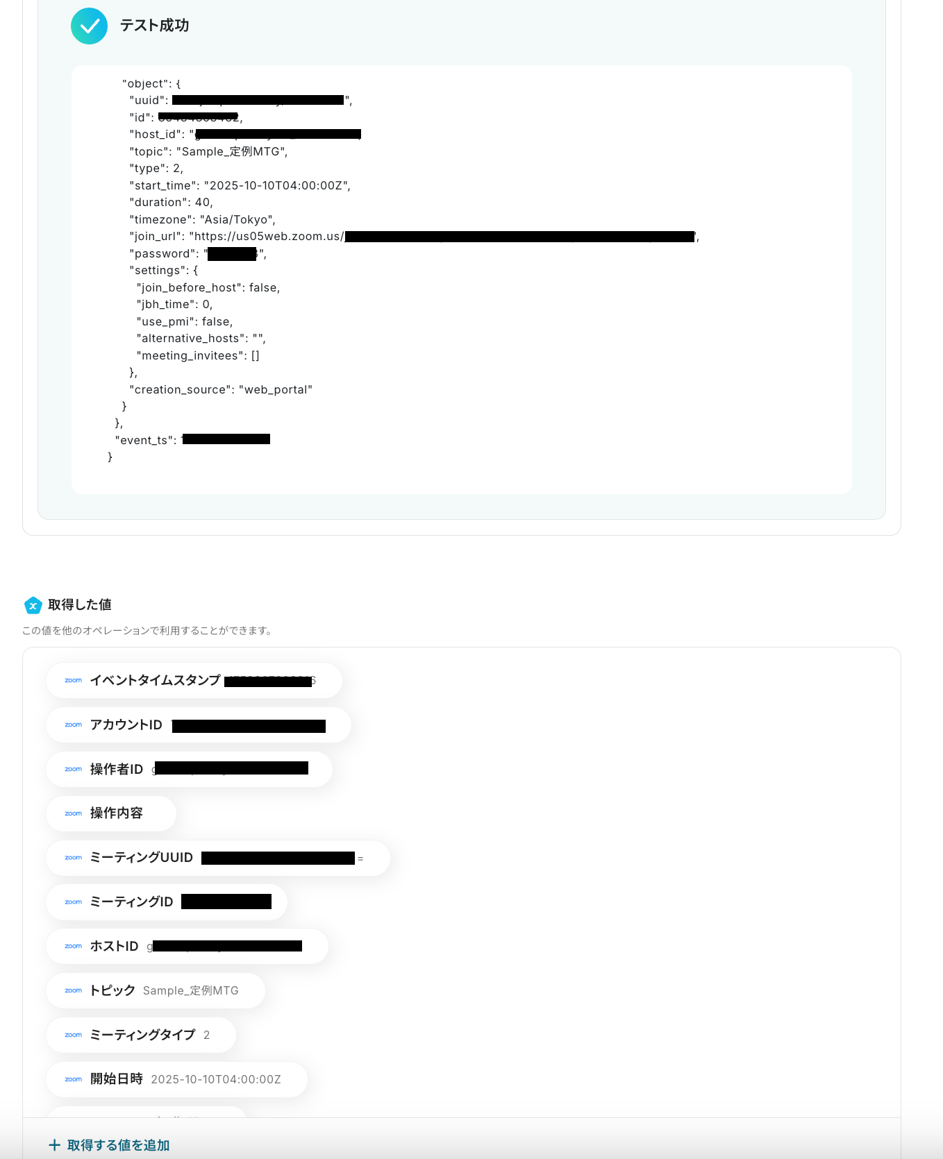 テストが成功すると、テスト用に作成したミーティング情報が「取得した値」に抽出されるので、内容を確認しましょう。