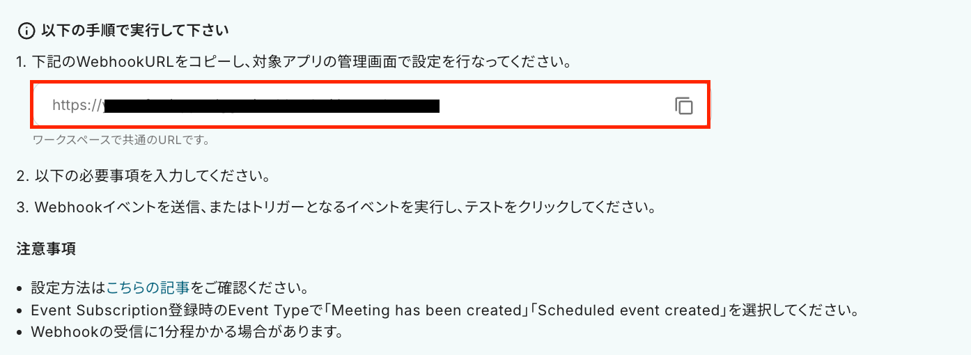 コピーしたテンプレートの「ミーティングが作成されたら(Webhook)」をクリックしてください。