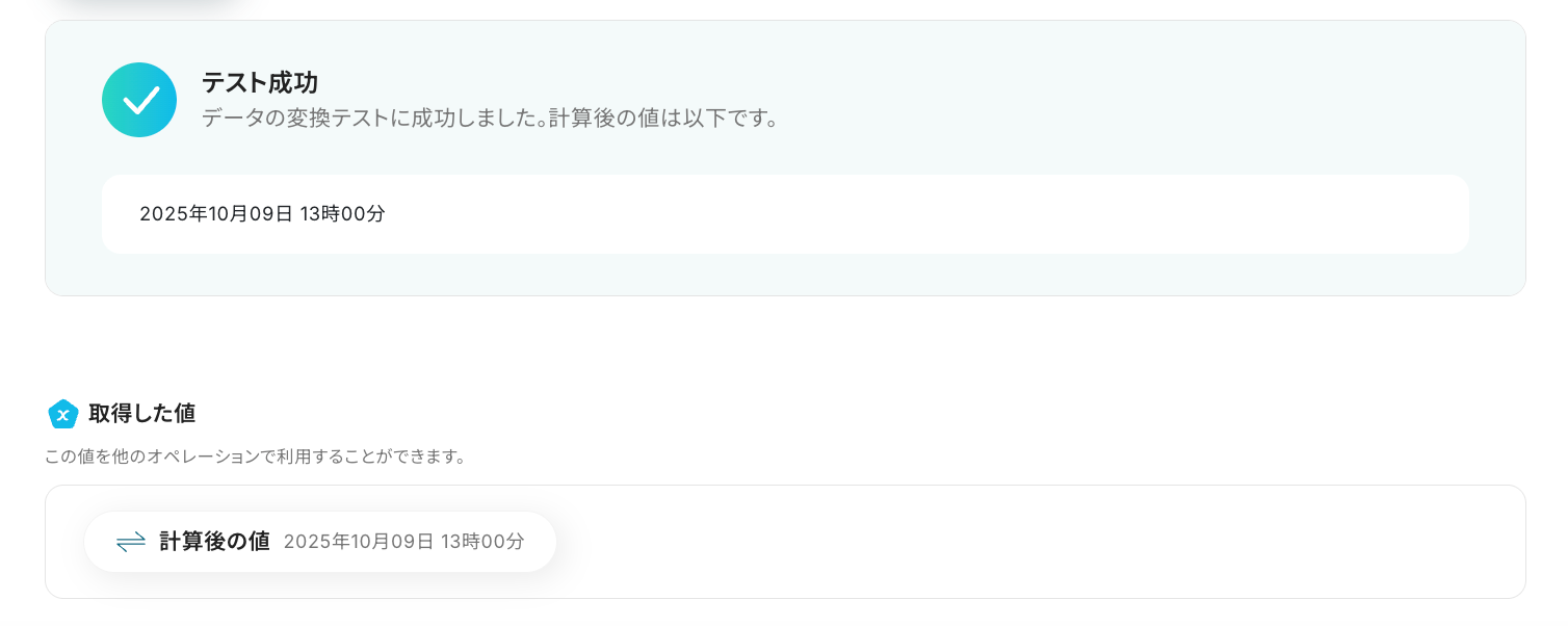 テストを成功させることで「取得した値」が取得でき、前述したように後続のオペレーション設定時に活用できます。