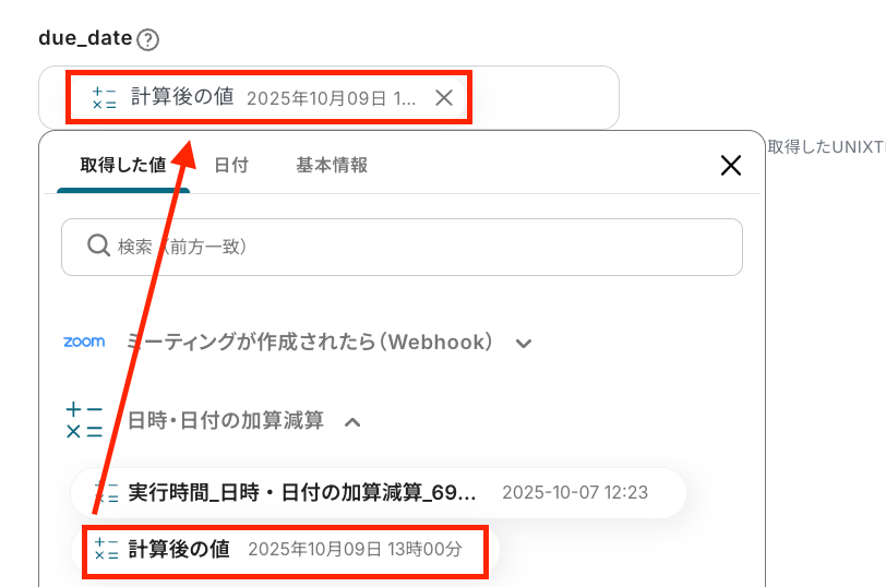 今回は、ClickUpに自動作成するタスクの期日を、Zoomミーティング開始の「24時間前」に設定できるようにするために、このオペレーションをフローに入れていますよ!